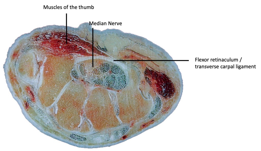 At the base of the hand, there is a ligament called the transverse carpal ligament or also known as the flexor retinaculum (see diagram below). A large nerve (the median nerve) and all the tendons that bend the fingers and thumb pass underneath this ligament on their way from the forearm into the hand. The space below the ligament is known as the carpal tunnel. The median nerve supplies sensation to the fingers, and some of the hand muscles (diagram below).