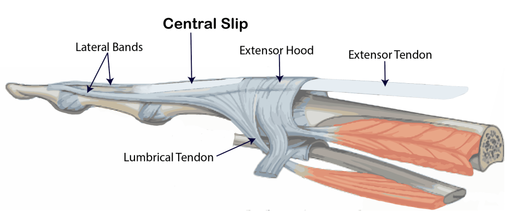 The central slip is the name given to the tendon responsible for pulling the middle knuckle joint straight. The anatomy of the extensor mechanism in the finger is complex and intricate. The main extensor tendon enters the finger over the back of the first knuckle, where it is easy to see through the skin. The tendon then merges with a flat sheet of tissue called the extensor hood. This extensor hood wraps around the back of the joint and merges with deep ligaments within the finger.
