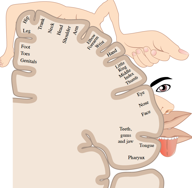This image shows the area of the cortex of the brain and the part of the body it controls – you can see that the face and the hand are disproportionately represented, because of the amount of information transmitted to the brain from these parts of the body.