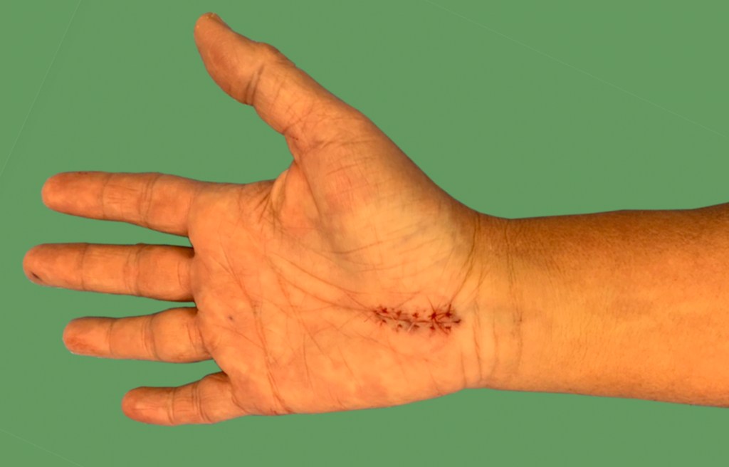 The scar is usually around 4cm long and quite tender to begin with. People often think that once the skin has healed the hand should feel normal, but because the surgeon has divided a thick ligament, it usually takes much longer for the hand to feel back to normal. As a rough guide: