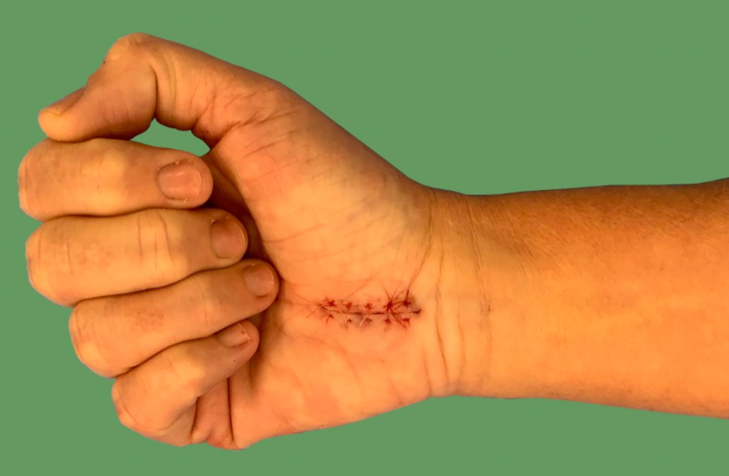 6 weeks – The scar is red and still tender. The area around the scar feels firm and tender. It is still uncomfortable to put pressure on the hand, and grip still feels weaker than normal.