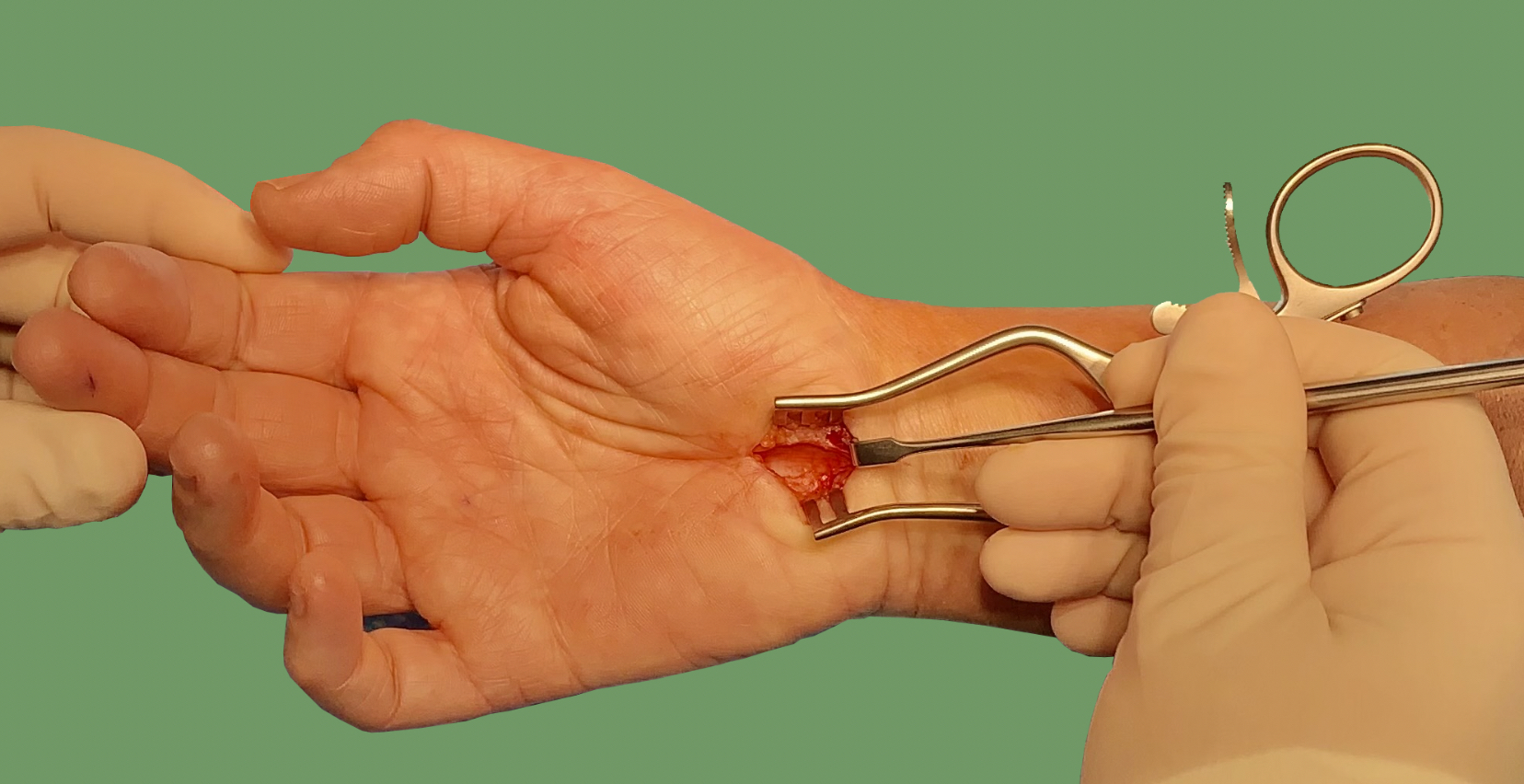 The surgeon’s job is to divide the ligament at the base of the hand – the nerve runs underneath this ligament, and as soon as it is divided, the pressure on the median nerve is relieved.