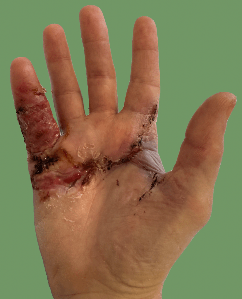 The surgeon’s job is to remove the thickened band or cord in the ligament which is causing the finger to curl towards the palm, as well as the overlying skin. This allows the finger to become straighter. A skin graft is then put over the finger where the diseased skin has been removed. The skin graft is used for the finger only – not the palm. We often use an ‘open palm‘ technique in Fife. This means that we do not stitch up the wound in the palm. The open palm wound heals beautifully, and leaves a fine scar despite the early appearance. A dressing and a plaster cast is applied for around 10 days after the surgery.