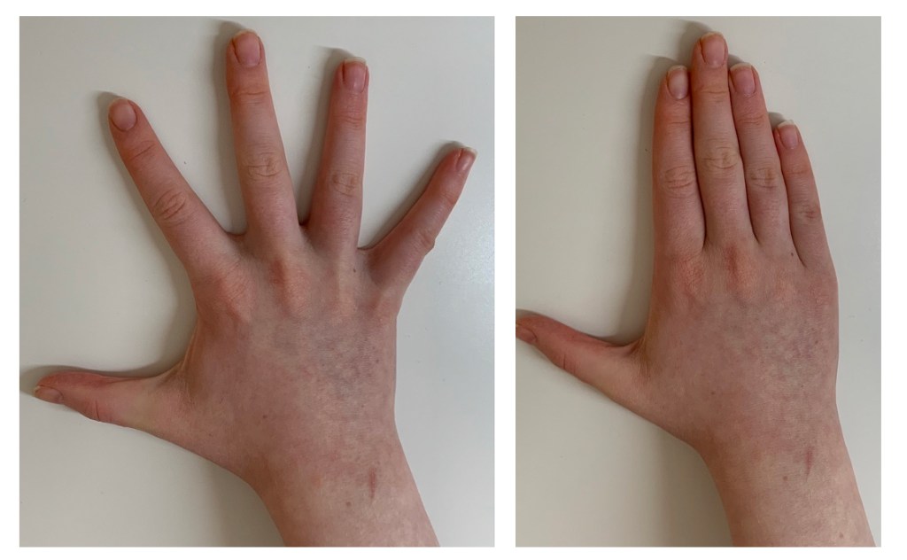 Bring your fingers into a position where the base joints remain extended and the finger joints flexed. Secondly, reverse this position so that the base joints are flexed and the finger joints extended.