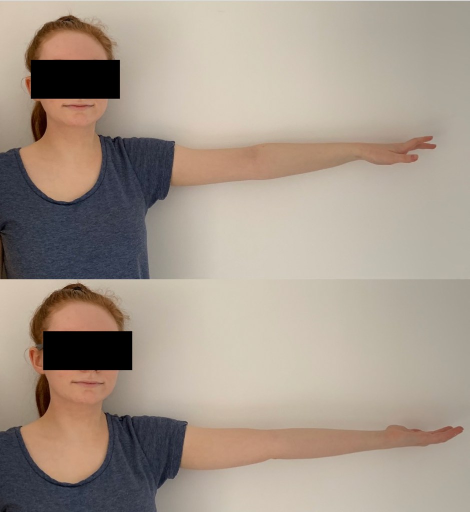 Lift your arm out to the side to around 90°. Turn your palm up to face the ceiling and down to face the floor.