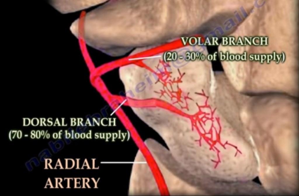 2) Blood supply to the bone. Blood, which is essential for healing, is supplied from the far end of the scaphoid, and runs back down the bone towards the wrist. The near end of the scaphoid therefore has a poor blood supply and a fracture can easily cut it off preventing healing.