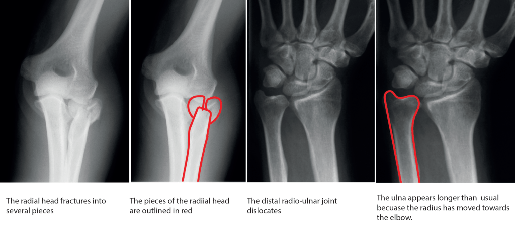 People with this injury usually have pain in their elbow primarily. This often overshadows pain in the forearm or wrist, and may focus attention on the elbow. When a broken or fractured radial head is seen on the first xray, doctors may assume that this is the only injury, and it is for this reason that this injury can be missed initially. A further xray of the wrist will show the characteristic dislocation of the distal radioulnar joint.