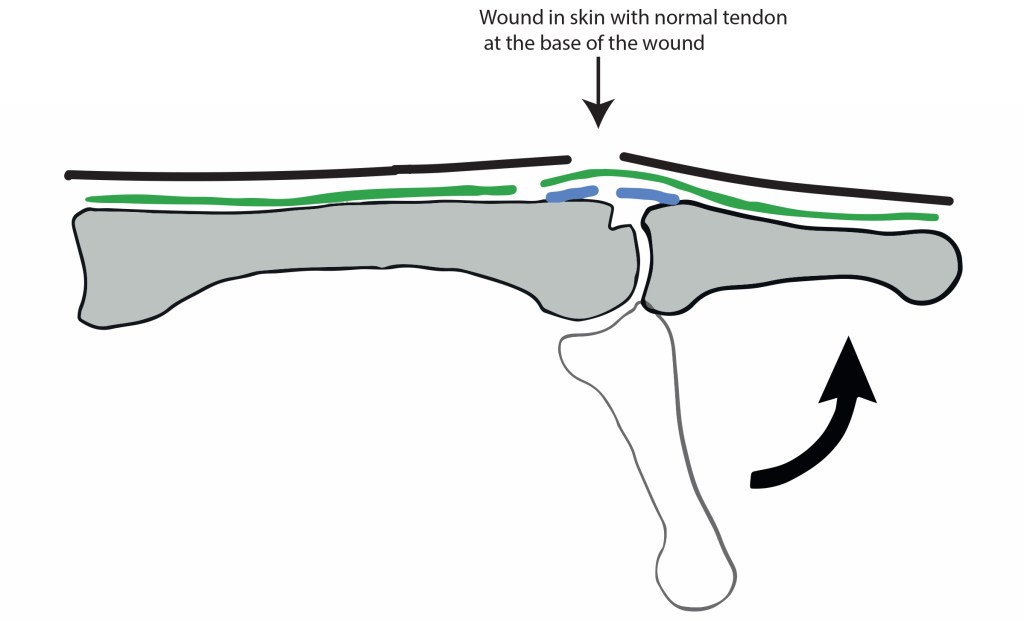 If the hand is then clenched into a fist, the tendon laceration lines up with the skin cut again, and the examiner can then usually see right down to the joint surface.
