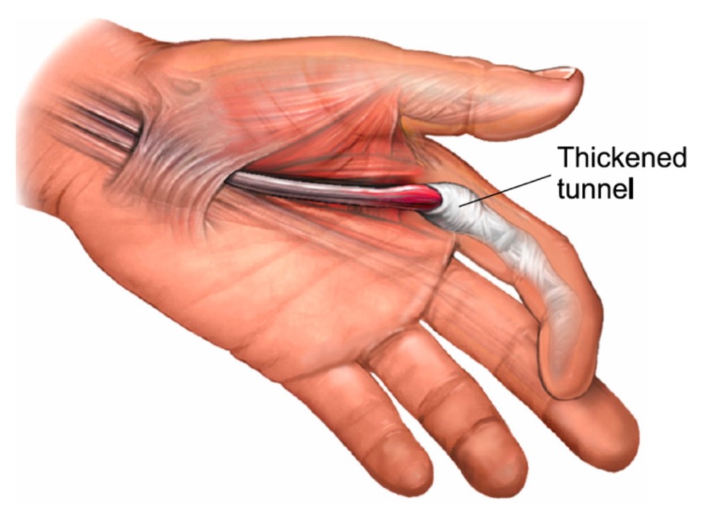 As the tendon passes into the digit, it goes through a series of tunnels (pulleys). Thickening at the entrance to the tunnel creates a roughness on the tendon surface. This causes inflammation to develop which narrows the tunnel and the space for the tendon to glide. This in turn causes the tendon to catch.