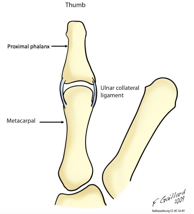 The UCL of the thumb is injured as a result of a fall onto the hand, where the thumb is caught and takes the weight of the body through it. The injury is also known as Skier’s thumb, since skiers are particularly prone to this mechanism.